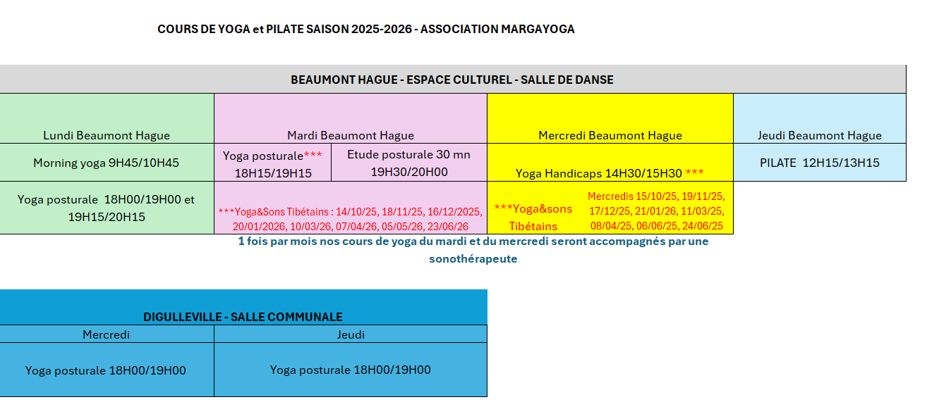 Planning des cours de yoga ET de pilate à Beaumont Hague et Digulleville SAISON 2025-2026- Reprise des cours dès le 15 septembre 2025 (inscription www.margayoga.org)